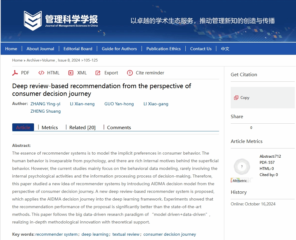 In August 2024, Professor Li Xianneng's team published the Deep Review-based Recommendation from the Perspective of Consumer Decision Journey in the 8th issue of the Journal of Management Sciences in China. Led by Li Xianneng, Professor and corresponding author, the research team included first author Zhang Yingyi (doctoral candidate), Guo Yanhong (Professor), Li Xiaogang (master’s student), and Zheng Shuang (doctoral student). The paper was recognized as a 2024 Key Highlighted Article. Sponsored by the Department of Management Sciences of the National Natural Science Foundation of China (NSFC), the Journal of Management Sciences is an authoritative first-tier academic journal in China's management science field.