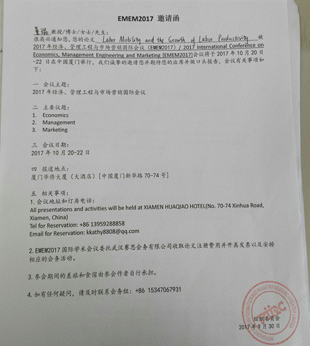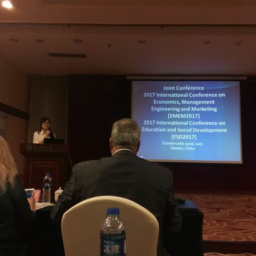 2017经济、管理工程与营销国际会议(EMEM2017)是专门针对从事经济学,管理工程与营销相关领域专家和学者举办的年度科学国际会议。参会过程中听取了Dr. Carlos Juiz、Prof. Hui-Ming Wee、Prof. Xu Chen、Dr. Gang Xie等专家的主题演讲,对自己的论文进行了口头汇报,并与参会的其他学者进行了学术交流。