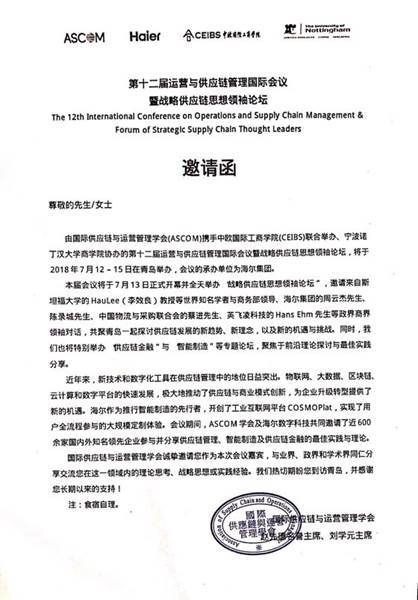 本次会议由国际供应链运营管理学会和中欧国际工商公司主办,宁波诺丁汉大学商公司协办,由海尔集团协办。会议同时邀请了商界、政界和学术界的知名人士和思想领袖,探讨了供应链发展的新趋势、新理念以及新的机遇和挑战。