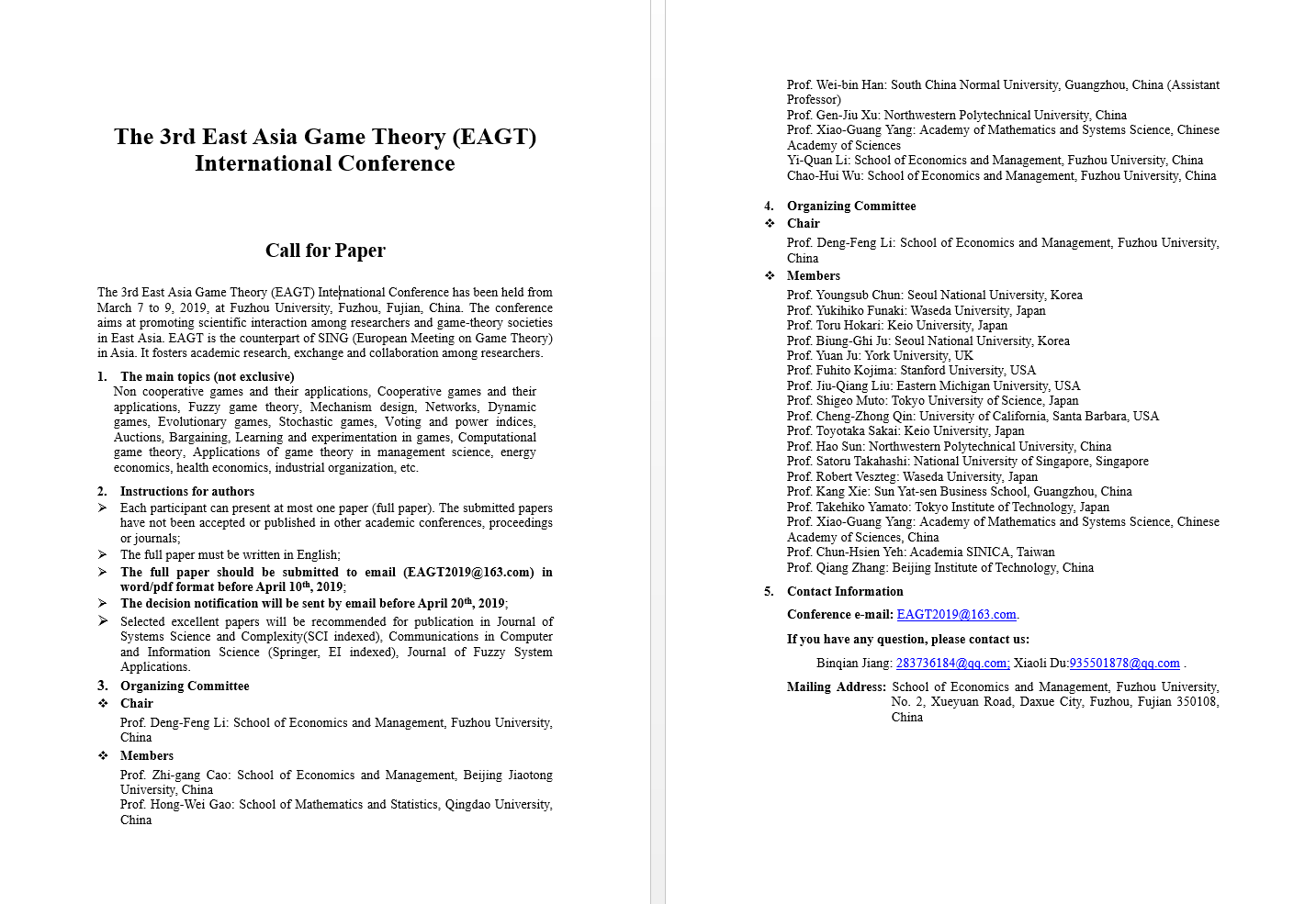 福州大学,东亚博弈论会议,中国运筹学会博弈论分会