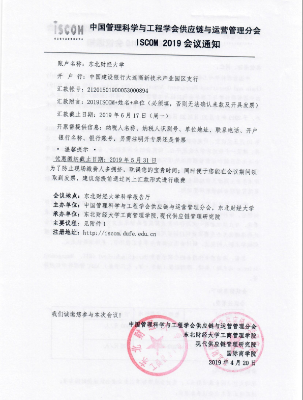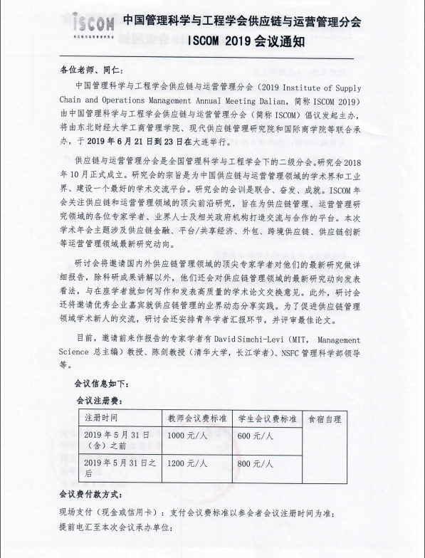 本人于6月21日至23日,参加了在东北财经大学举办的中国管理科学与工程学会供应链与运营管理分会2019年会。本届年会重点聚焦“供应链管理”和“运营管理”两大领域的互动合作,探讨互联网金融和供应链金融领域的前沿性重大热点问题,搭建学界与业界的交流平台。会议邀请了来自美国麻省理工公司David Simichi-Levi教授、清华大学bevictor伟德官网陈剑教授、国家自然科学基金委员会管理科学部吴刚研究员、中铁铁龙集装箱物流股份有限公司负责人李长宏博士四位国内外供应链管理领域的顶尖学者与业界精英做大会主题报告。来自美国新泽西州立大学、伊利诺伊大学香槟分校、圣路易斯华盛顿大学、圣克拉拉大学,明尼苏达大学,加拿大多伦多大学、清华大学、复旦大学、浙江大学、厦门大学、华中科技大学、同济大学等近400位学者及企业代表参加了本次会议。本次会议还设有4场国际学者论坛、5场杰出学者论坛、4场教学交流论坛、3场项目申请交流论坛以及5场业界分论坛,共计52场论坛。通过聆听知名学者的报告和与供应链与运营管理领域专家之间的沟通与交流,提升了自己在供应链与运营管理领域的科研水平。