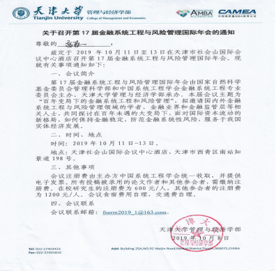 会议由国家自然科学基金委员会管理科学部和中国系统工程学会金融系统工程专业委员会主办,由天津大学管理与经济学部承办。本届会议主题为“百年变局下的金融系统工程和风险管理”
