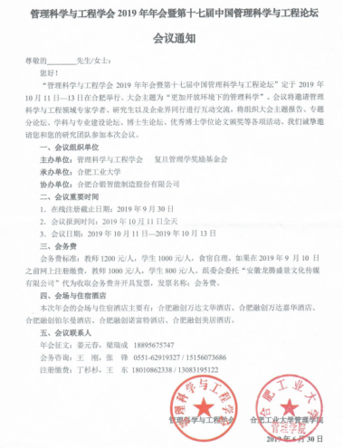 管理科学与工程学会年会2019年年会暨第十七届中国管理科学与工程论坛