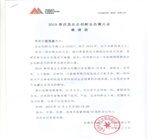 11月4日,以“向未来•赋新生”为主题的2019第四届企业创新生态圈大会在凤岗天安数码城T5国际会议中心成功举行。