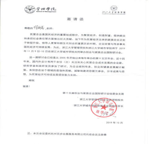 第十五届创业与家族企业成长国际研讨会将于2019年11月9日-10日在杭州举行。会议由浙江大学城市公司、浙江大学管理公司联合主办,浙江大学管理公司企业家公司承办。本次会议的主题为“跨代创业”。该大会得到了浙江大学管理公司团队建设资金、浙江大学城市公司工商管理省级一流团队建设资金的资助。浙江大学方太家族企业研究基金将提供十五万元人民币奖金授予参会最佳论文获奖者(重点资助从事创业与家族企业研究的年轻学子)。会议邀请国内外研究学者、家族企业服务机构专业人士参与交流。本届会议在浙江大学城市公司举办。