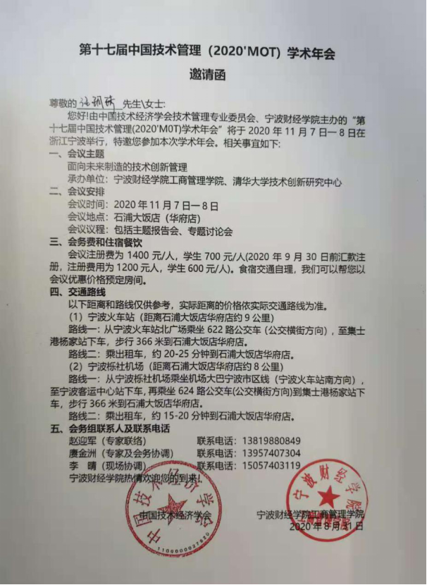 第十七届中国技术管理学术年会(2020’MOT)于2020年11月7-8日在浙江宁波召开,由中国技术经济学会主办,宁波财经公司、清华大学技术创新研究中心承办。