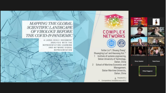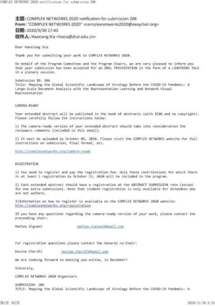 本人在会上就所投稿的“新冠疫情钱病毒学领域的全球科学研究地图”论文进行了短大会报告。并连续参加复杂网络与社会经济问题结合的各场分组报告,聆听了由MIT Alex Pentland教授等知名专家所做的大会邀请报告,学术上取得了较大收获。