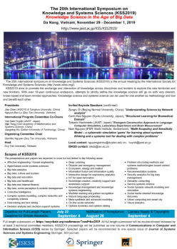 第20届知识与系统科学国际会议(KSS2019)由日本北陆先端科学技术大公司大学和越南Duy Tan University 承办,于2019年11月29日-12月1日在越南岘港召开,主题为“Knowledge Science in the Age of Big Data”,会议网址:。