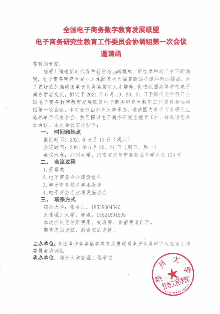 全国电子商务数字教育发展联盟电子商务研究生教育工作委员会协调组第一次会议,由全国电子商务数字教育发展联盟电子商务研究生教育工作委员会协调组主办,郑州大学管理工程公司承办,邀请国内电子商务公司产品单位代表参会,共同探讨电子商务研究生教育工作。