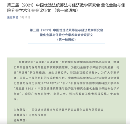 会议简况:疫情冲击与“双循环”驱动背景下金融学与保险学面临新的挑战与机遇,学者们聚焦金融与保险的量化研究和实践应用。为推动金融学与保险学的新发展,构建“双循环”新发展格局,推动世界经济,特别是我国经济复兴,为广大专家学者、业界人士提供更好的交流合作平台,中国优选法统筹法与经济数学研究会量化金融与保险分会定于2021年7月16日-18日在河南省洛阳市河南科技大学举办“第三届(2021)中国优选法统筹法与经济数学研究会量化金融与保险分会学术年会”。