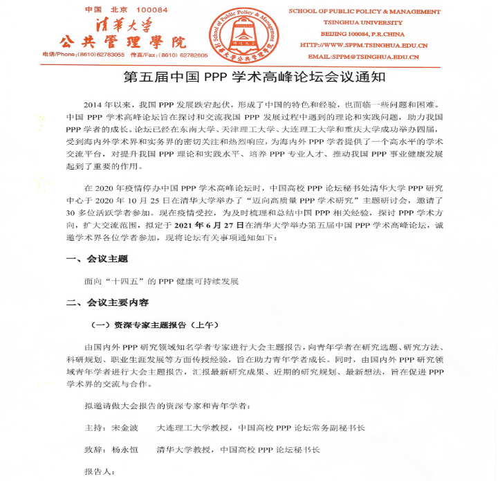 2021年6月27日,由中国高校政府和社会资本合作(简称PPP)论坛主办、清华大学PPP研究中心承办的第五届中国PPP学术高峰论坛在北京成功举行,论坛主题为“面向‘十四五’的PPP健康可持续发展”,来自全国40余所高校的130余位专家学者参加。