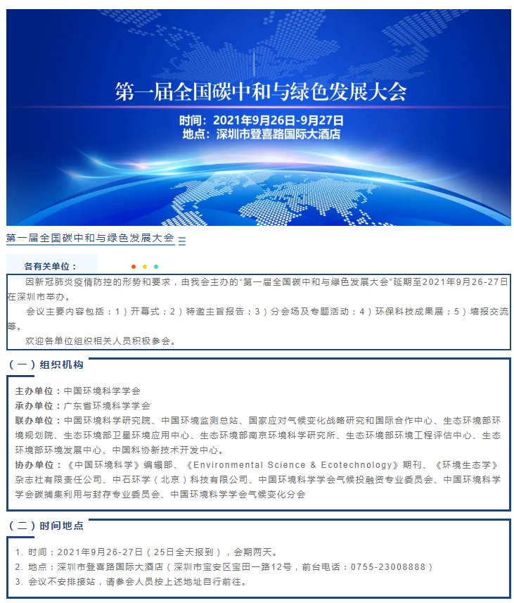 会议简况:由中国环境科学学会主办的“第一届全国碳中和与绿色发展大会”于 2021年9月26-27日在深圳市举办。会议期间主要围绕减污降碳、绿色低碳等主题举办生态环境新技术、新产品与新仪器成果展示活动,展示创新成果、优秀技术和成功经验。会议共安排有15个分会场30个学术议题,以及墙报交流和创新科技成果展示活动,具体内容包括“碳中和目标下的中国碳达峰”、“低碳路径与碳达峰管理政策创新”等与碳中和与碳达峰相关的战略、政策与发展路径议题;“碳排放检测、评估与影响”、“温室气体卫星遥控监测与应用”等与碳排放检测、评估与影响等相关议题;以及碳中和目标下的全国碳市场建设议题等。