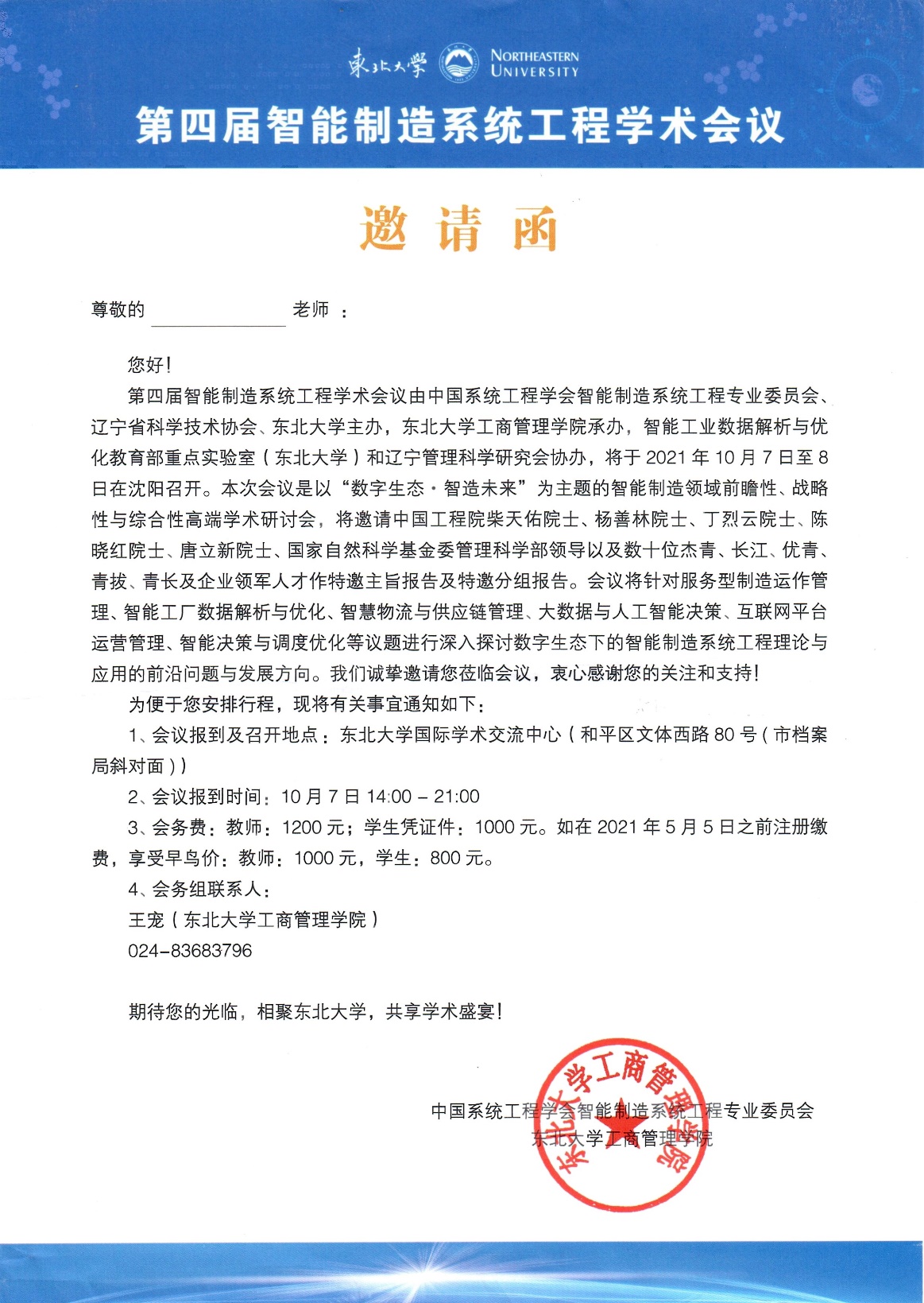 中国系统工程学会智能制造系统工程专业委员会、辽宁省科学技术协会、东北大学