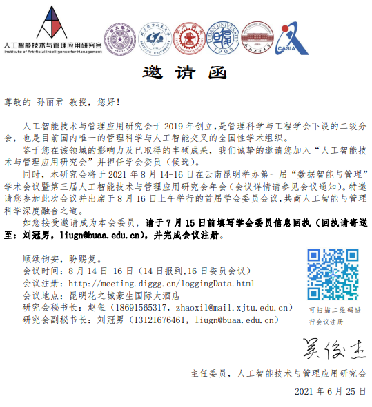 会议有多位国家工程院院士、杰青、优青及管理科学与信息系统工程专家参加,加深了我对人工智能方法在一般性管理问题、物流与供应链管理、决策支持等方向上应用的认识。本人很荣幸作为人工智能技术与管理应用研究会的委员受邀出席会议,且博士研究生李方方的论文被推选为张贴论文,全程参加了论文海报张贴和讲解,参会过程中与诸多相关领域学者进行了深入的交流,收获颇多。