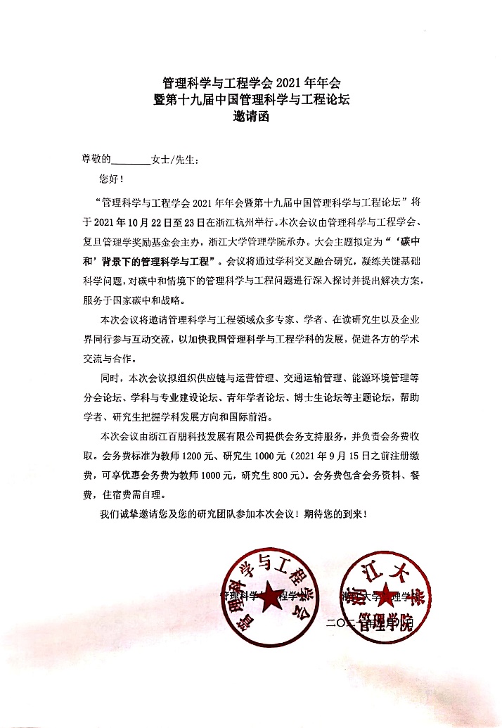 管理科学与工程学会2021年年会暨第十九届中国管理科学与工程论坛