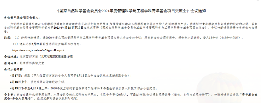 为促进我国管理科学与工程学科领域青年学者学术水平与研究能力的提高,加强管理科学与工程学科青年基金主持人之间的学术交流,共同探讨青年学者成长与成功的经验和心得,国家自然科学基金委员会管理科学部定于2023年4月18日至19日在北京召开《国家自然科学基金委员会2021年度管理科学与工程学科青年基金项目交流会》。会议特邀请优秀青年学者做大会报告。