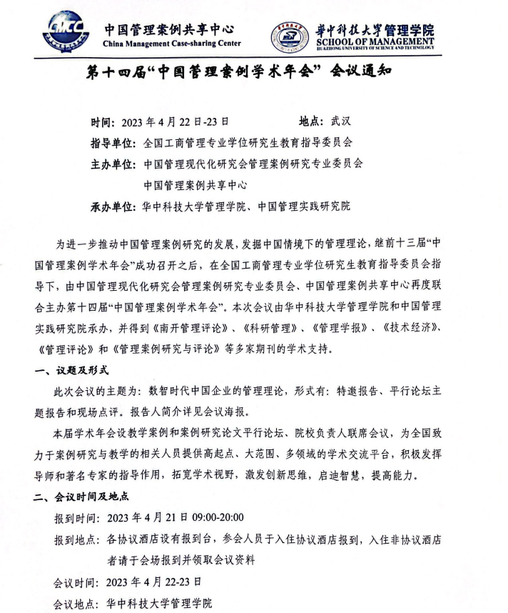 由全国工商管理专业学位研究生教育指导委员会、中国管理现代化研究会管理案例研究专业委员会、中国管理案例共享中心主办,华中科技大学承办