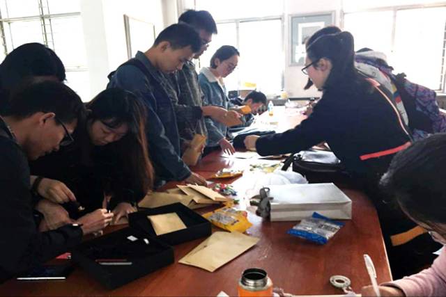 2017年4月3日上午,全体成员共同制作精美小礼品:装有糖果和一张明信片的大工信封,并亲手在信封封口处烙上火漆印,文艺用心,且富大工艺术。以此作为捐赠者的小礼物之一。