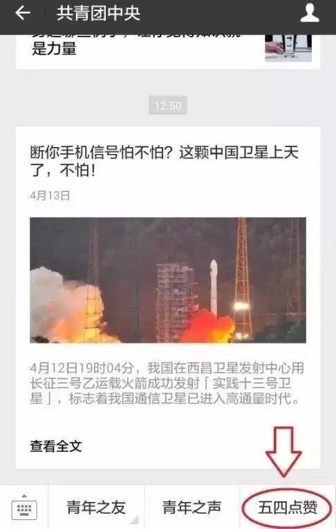 2.进入“共青团中央”微信号界面,点击界面右下方“五四点赞”栏目,进入点赞界面。