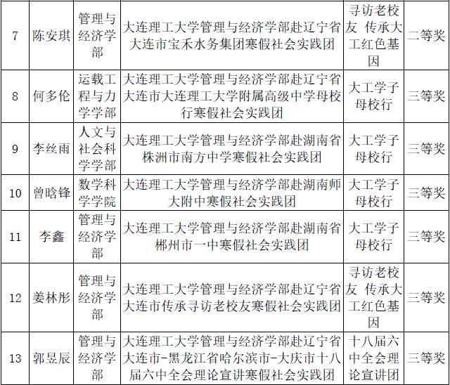 按照寒假社会实践活动的获奖比例,一等奖优秀个人数目=参加社会实践总人数*5‰,二等奖优秀个人数目=参加社会实践总人数*10‰,三等奖优秀个人数目=参加社会实践总人数*20‰,经各获奖团队直推,管经学部共推荐13名同学分获寒假社会实践优秀个人校一、二、三等奖。