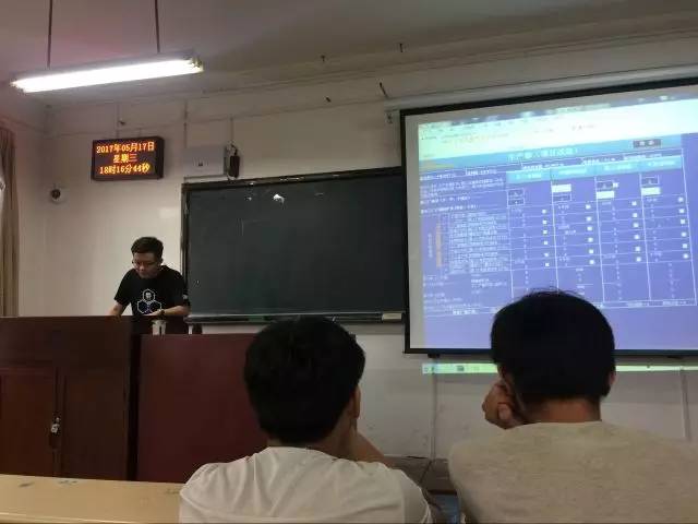 首先是15级的张佳天同学为大家简单介绍了比赛形式和软件的基本操作,并分享了自己对于比赛中高质型经营模式的了解以及参赛经验。