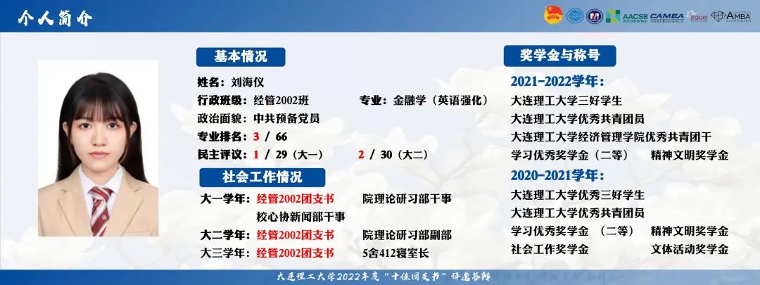 刘海仪同学连续三年担任经管2002团支部书记,前两年民主评议均位列班级前列,曾获伟德官网bv1946优秀三好员工,优秀共青团员等称号。