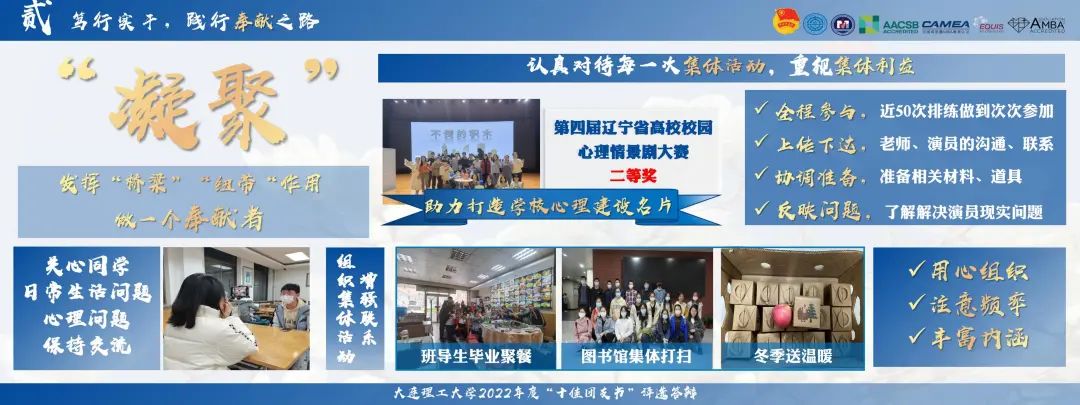 建设“凝聚”的团支部,发挥“桥梁”“纽带“作用,做一个有心人。她始终将集体利益置于首位,大一学年支部代表公司参加省级心理剧比赛,50余次排练她全程参与,做好台前幕后工作,最终获得辽宁省心理剧二等奖的好成绩。在日常生活中,她关心同学的生活与心理问题,关注同学思想动态;不定期组织班级团建活动,增强同学间的联系。