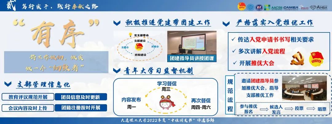 建设“有序”的团支部,做一个“细致者”。对于支部建设,她坚持落实支部信息化管理;坚持落实“党建带团建”机制,密切联系团建指导员,共同进行支部建设;坚持落实青年大学习监督机制,做到有效督促;严肃对待入党推优工作,多次讲解入党流程,规范材料书写。