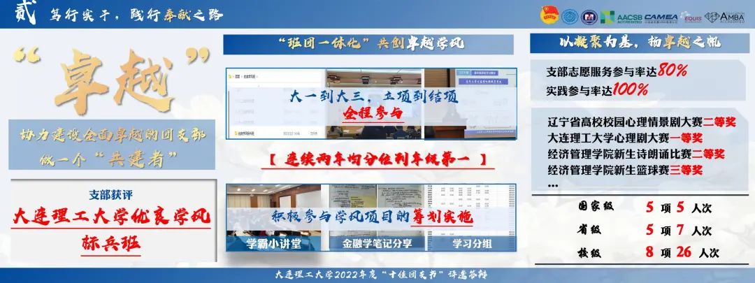 建设“卓越”的团支部,做一个“共建者”。她积极推进“班团一体化”机制,参与学风项目的筹划落实,从大一到大三,从立项到结项,做到全程参与,支部连续两年均分位列年级第一,在志愿实践,集体比赛,科创竞赛上均屡创佳绩,获评伟德官网bv19462022年度优良学风标兵班。