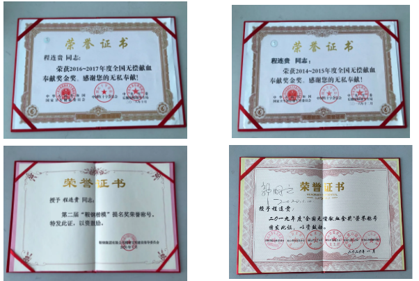 程连贵说,在挽救生命方面我所能做到的就是献血。一个人的生命是有限的,而创造价值的能力却是无限的。他多次为病情危重的患者紧急献血,为更多病人送去生的希望。十五年来他累计献血126个单位25200ML,其中献全血6次12个单位2400ML、献血小板67次114个单位。他作为人体器官(遗体)捐献志愿者,身体力行地学雷锋、学郭明义,用善行义举赢得了职工和群众的高度赞誉。