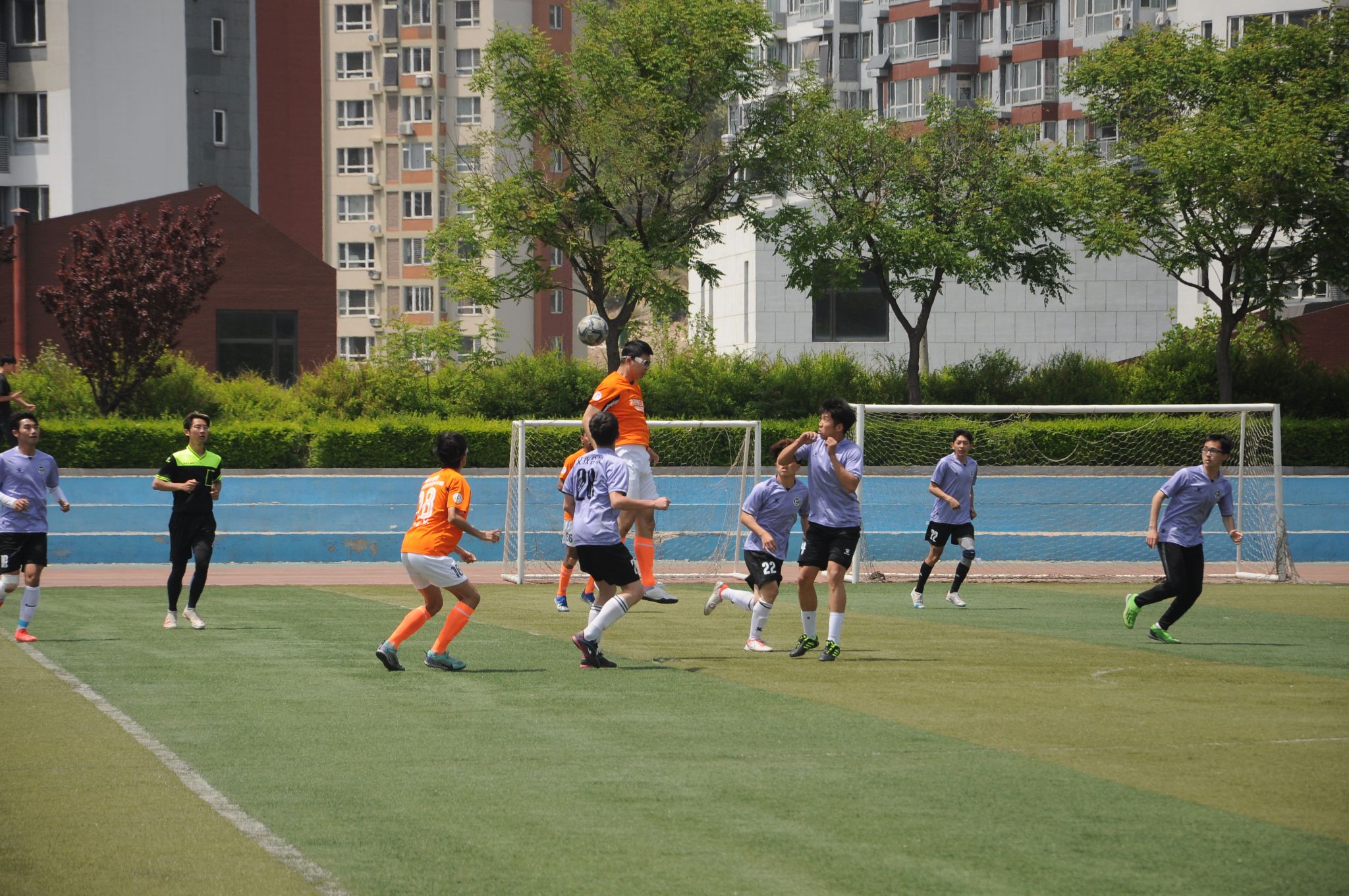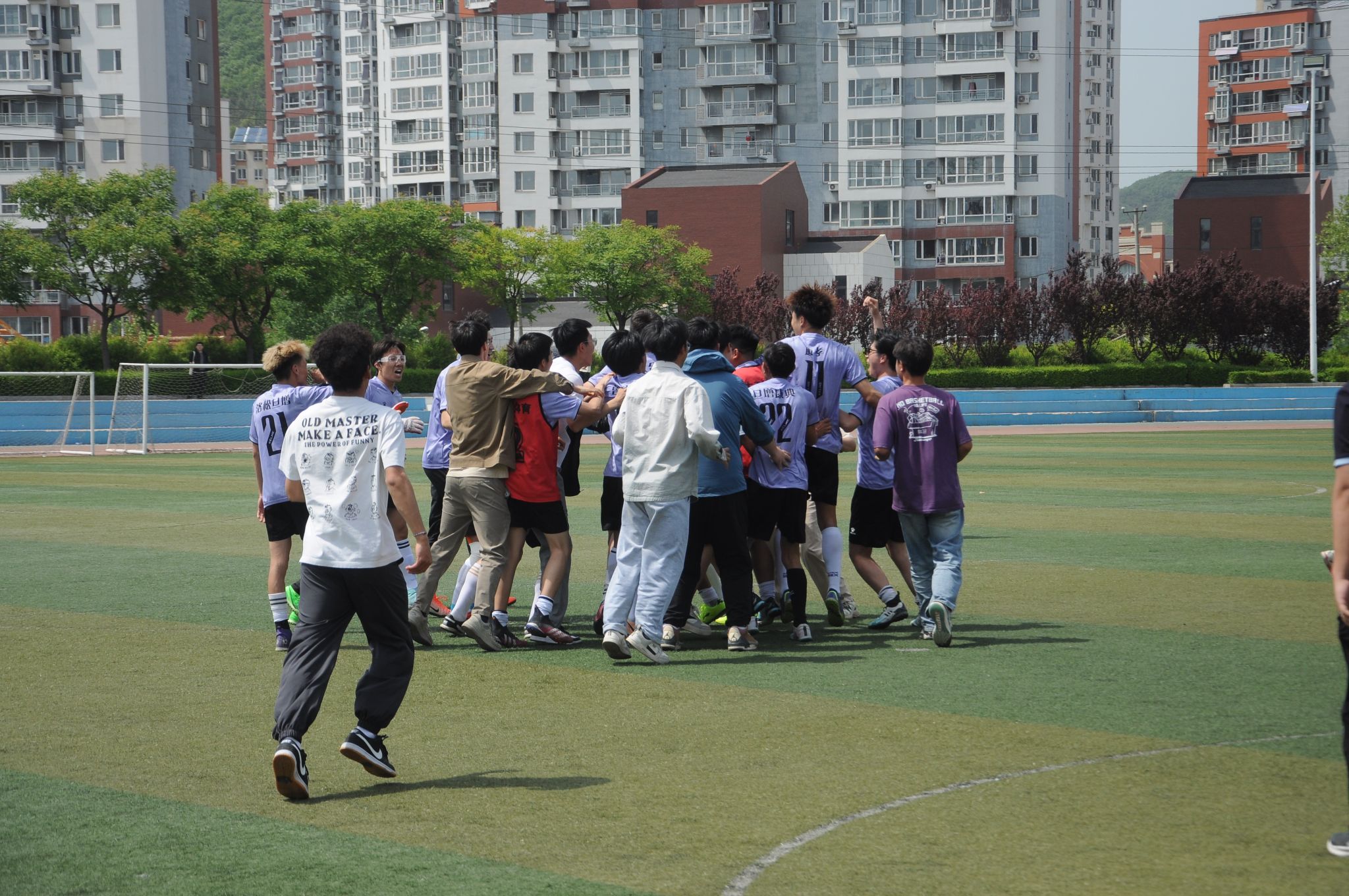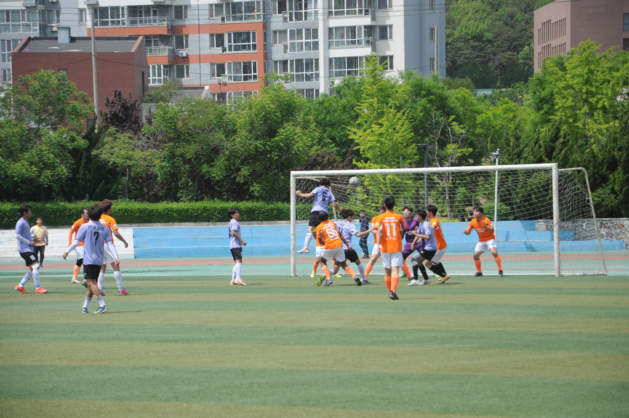 易边再战,经管没有被暂时的落后击垮,7号四郎次登、21号洛松旦增两位边锋化身双架马车,频繁冲击软件防线,6号新秀邝钟翊用精湛的步法在中场大显神威,软件防守节节败退,自乱阵脚,关键时刻,经管开出角球,6号邝钟翊飞速冲入禁区,舒展起跳,化身空中飞人,力压软件身高一米八五防守队员,头球顶入死角,经管1比1扳平比分!