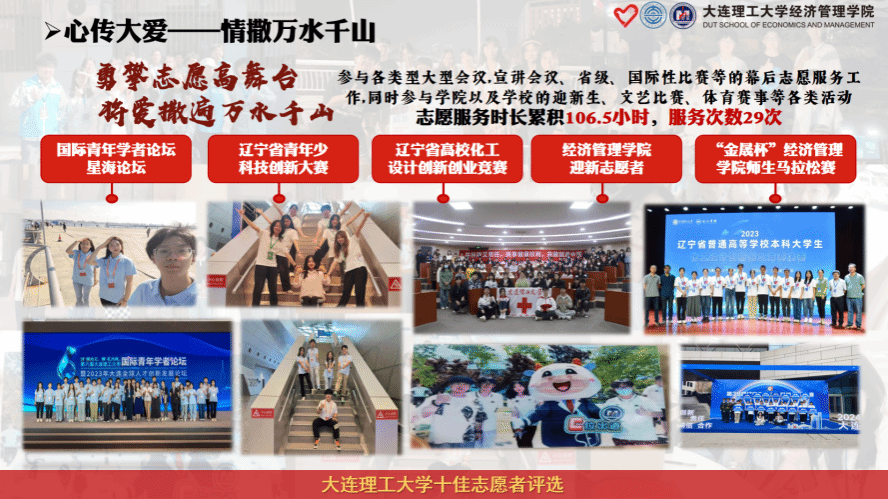 在志愿服务的旅途中,我逐渐感受到了越来越多人的认可,自己也变得更加自信和开朗,我也更加熟悉了如何面对突发事件和应对沟通问题,我想我已经有了能力,能站上更大的舞台,将温暖带给更多人,也号召更多人和我一起,投身向志愿服务的怀抱。从大连市马拉松到无偿献血,从辽宁省青少年科技创新大赛到国际青年学者论坛,在各个类型的大型活动中,累计志愿服务次数29次,服务时长109.5小时。