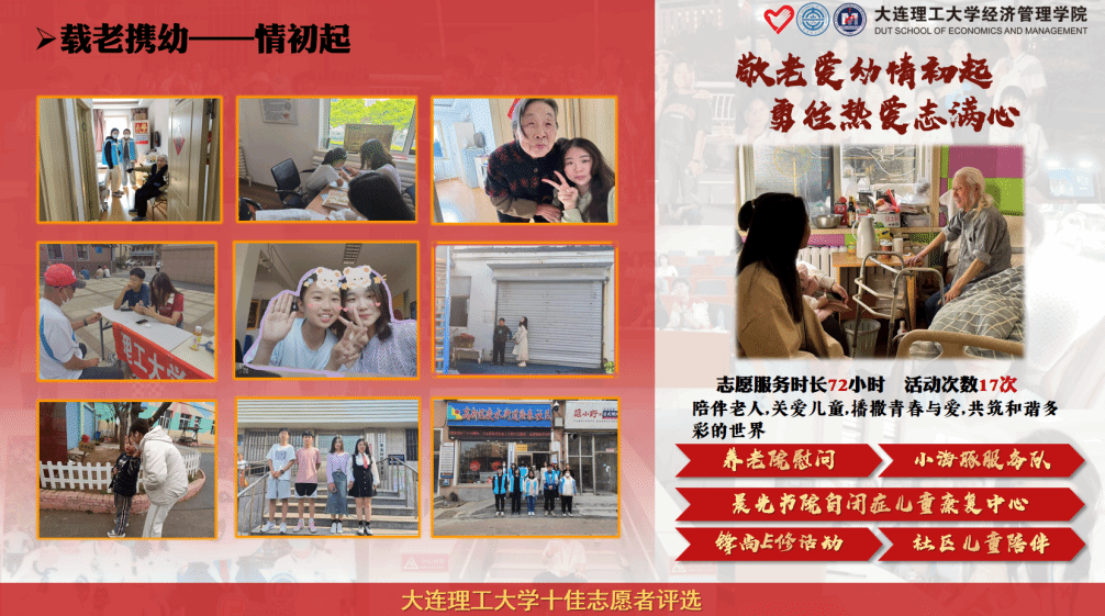 敬老爱老,关爱少年儿童,这里是我情谊初起的地方,从各个养老院到自闭症儿童康复中心,在耐心的聆听和陪伴中,我逐渐明晰了志愿的意义,体会到了服务他人,帮助他人的乐趣,在敬老携幼的领域里,参与服务17次,志愿时长累积72小时。