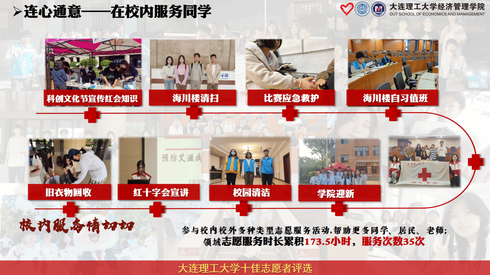 想把自己的能量带给更多需要帮助的人,想让自己小小的光芒在更多的场景中发热发光,于是我在力所能及的范围内尝试:在校外,我扎根基层,深入协助社区服务和治理;在校内,我服务同学,致力于营造更加和谐美好的校园环境。在校内校外匆匆的步伐里,服务次数35次,累积志愿服务时长173.5小时。