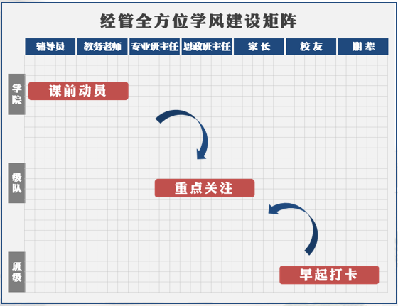 辅导员牵头,整合各方力量,从开课前教学副经理的动员,到每日早起打卡,再到期中、期末的重点关注,全力推进项目管理理念下学风班全过程建设。