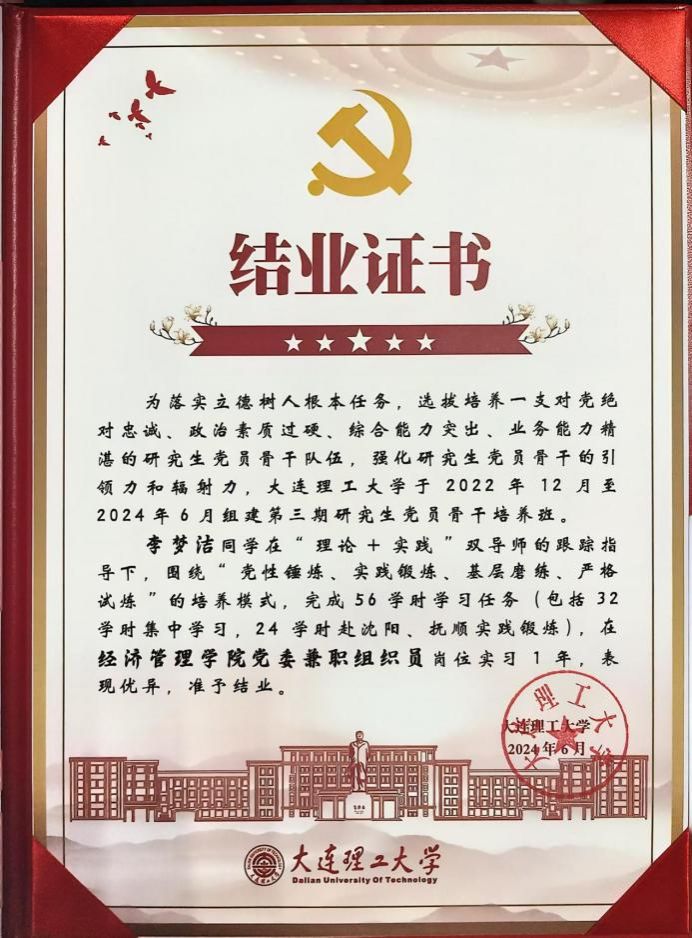 李梦洁,中共党员,bevictor伟德官网管理科学与工程专业2201班研究生,伟德官网bv1946第三期研究生党员骨干培养班学员,先后任管理科学与工程第二员工党支部、管理科学与工程第三员工党支部书记,现任信息与决策技术研究生导师纵向党支部组织委员。曾获辽宁省优秀毕业生、伟德官网bv1946优秀毕业生、优秀研究生、优秀团员、树人计划奖学金等荣誉及奖励。