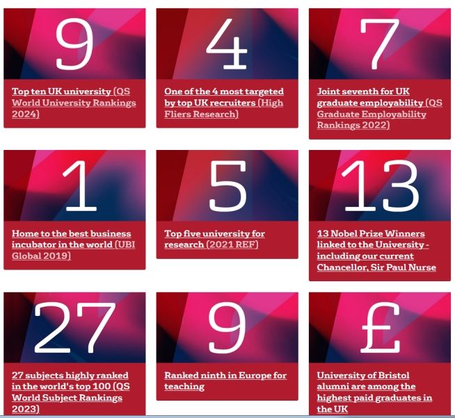 布里斯托大学(University of Bristol),简称“布大”,始建于 1876 年,位于英格兰西南部被誉为“欧洲硅谷”的布里斯托市,世界排名第55位(QS2024)、是世界一流研究型大学及英国著名的六所红砖大学之一。布里斯托大学拥有众多学术界教授和员工,其中包括 47 位皇家学会研究员、17 位英国科公司研究员、13位诺贝尔奖获得者。布里斯托大学被评为全英科研质量最好的五所顶尖研究型大学之一,其工程部素有“工程王国”之称。